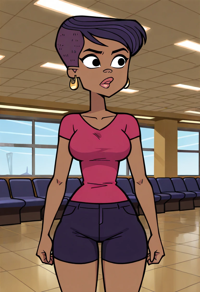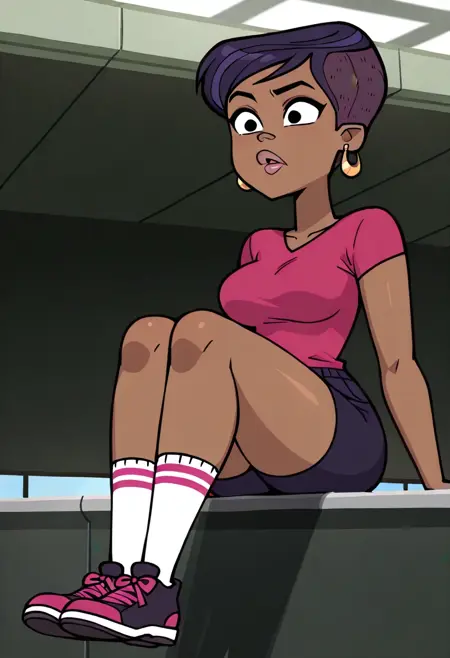 StephanieTDRR, 1girl, dark skinned female, short dark blue hair, red-magenta top, dark blue-purple shorts, knee-high white socks with magenta-pink stripes, gold hoop earrings, black eyes, magenta-pink shoes, lips, big lips,