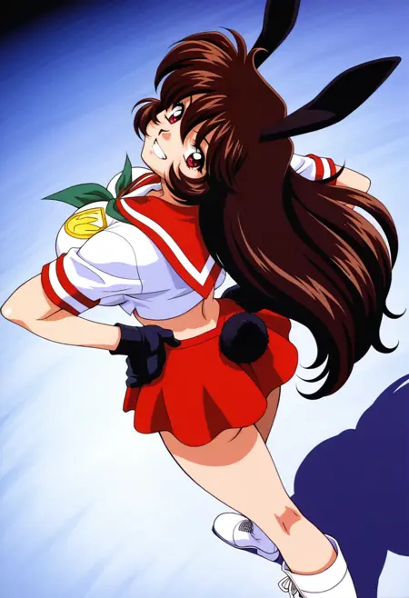 mimika, 1990s \(style\), brown hair, red eyes, black rabbit ears, black rabbit tail, large breasts, narrow waist,