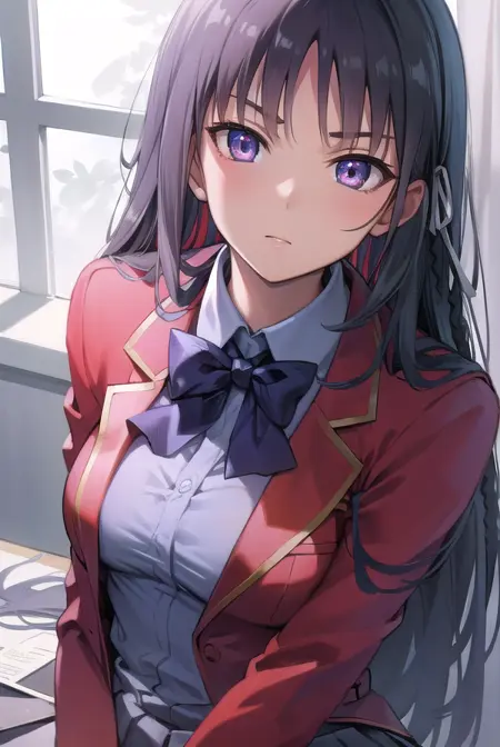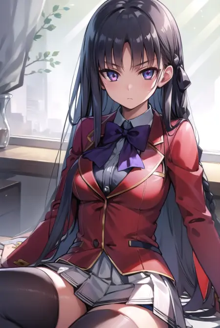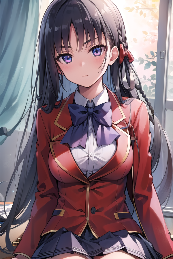 suzune horikita, black hair, braid, long hair, (purple eyes:1.1),