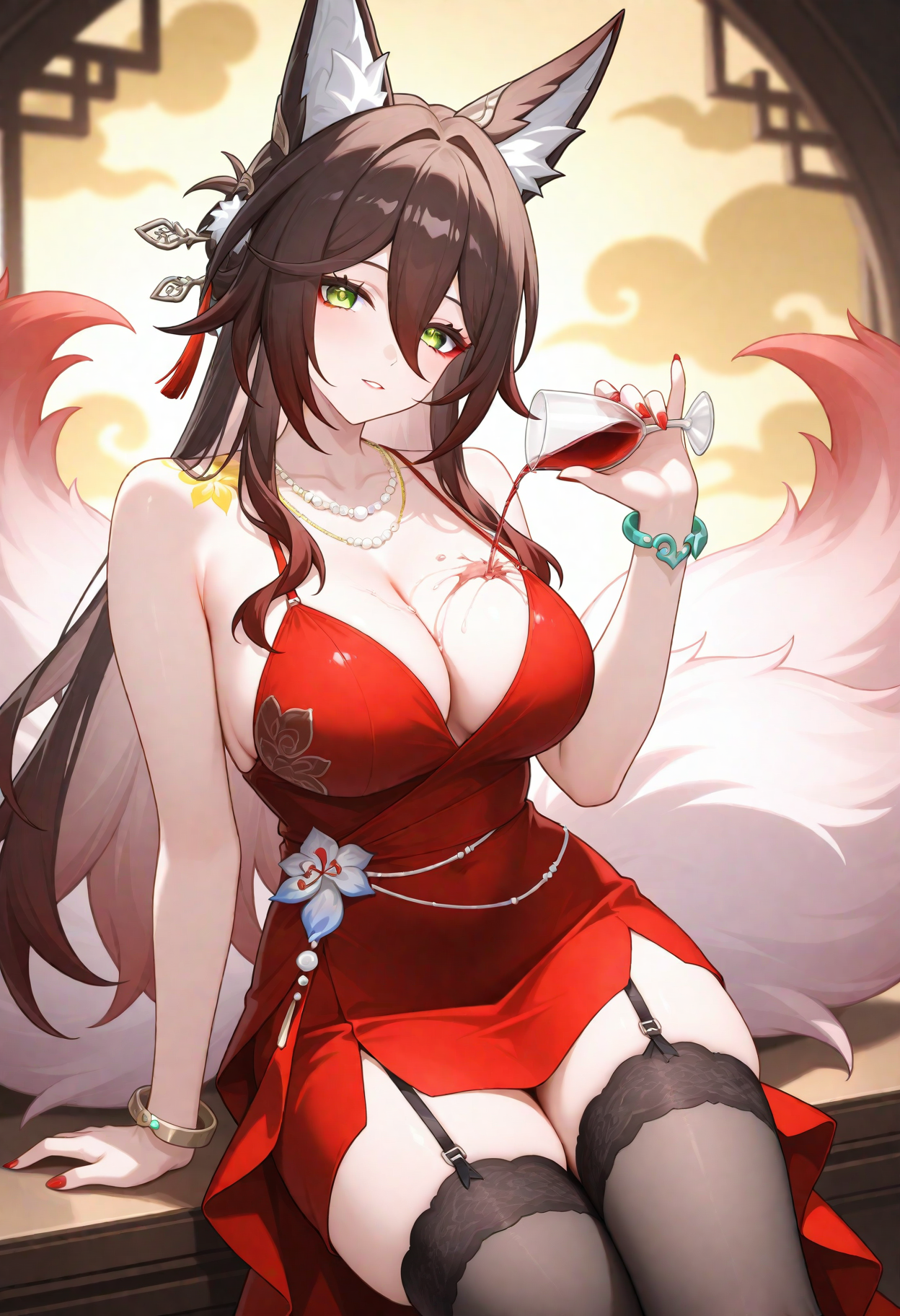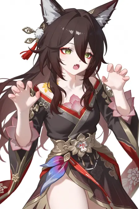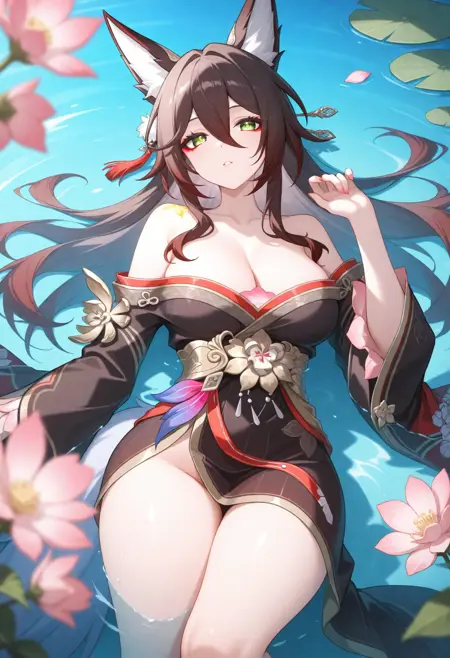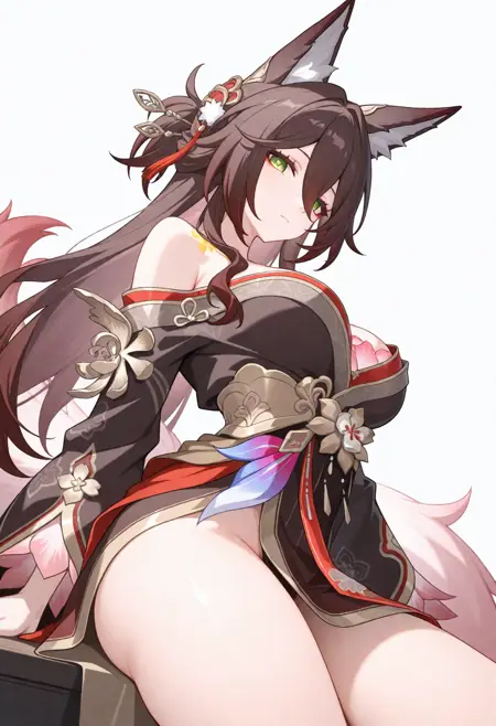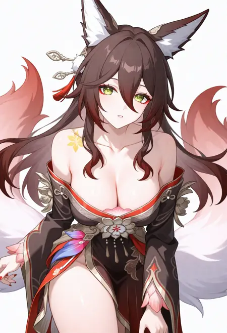 fugue \(honkai star rail\),1girl,동물 귀, 헤어 장식, 여우 귀, 싱글, 긴 머리, 어깨 노출, 여우 소녀, 꽃, 눈 사이의 머리카락, 일본 복장, 넓은 소매, 어깨 드리우기, 기모노, 여우 꼬리, 허벅지,