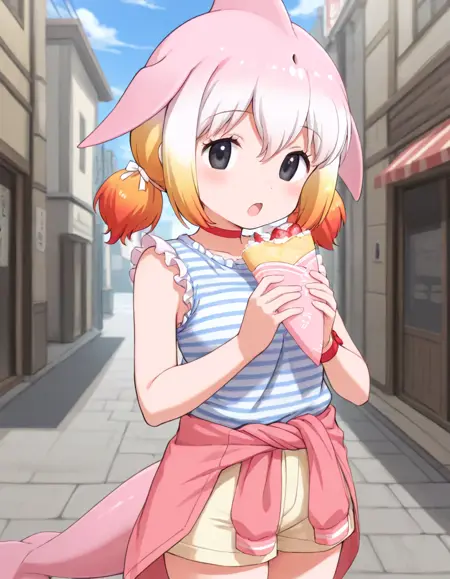 中华白海豚 \(兽娘动物园\), mc_cos, 头鳍, 海豚尾巴, 黑色眼睛, 粉色头发, 渐变发色, 低双马尾, 手环, 横条纹, 条纹衬衫, 腰部粉红色服饰, 无袖, 荷叶边袖子, 短裤