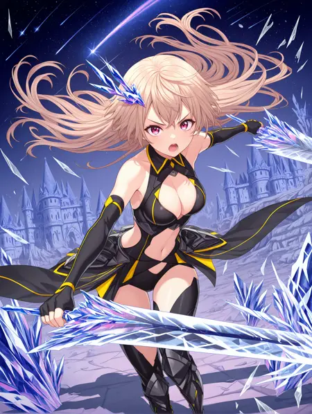 clothing cutout, cleavage, black leotard, bare shoulders, elbow gloves, fingerless gloves, black gloves, navel cutout, showgirl skirt, two-tone skirt, black skirt, colorful skirt, armored boots, black boots