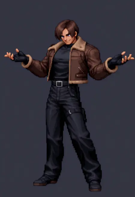 对于带夹克的RE4造型,使用:“le0nre4, 蓝眼睛, 短发, 刘海发, 棕发, 黑色衬衫, 黑色长裤, 黑色腰带, 黑色手套, 露指手套, 飞行员夹克, 棕色夹克”