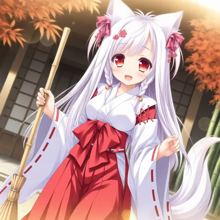miko,white kimono,red hakama,hakama skirt,long sleeves,wide sleeves,ribbon-trimmed sleeves,red ribbon,red bow,waist bow,red sash,
