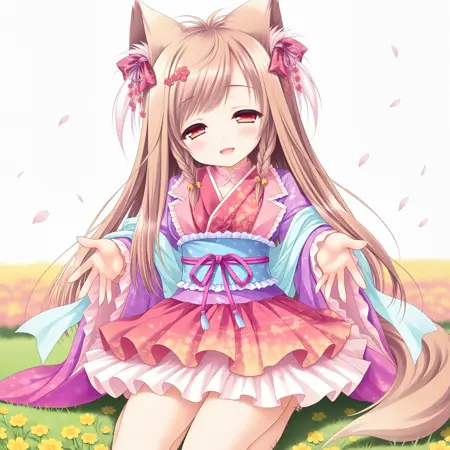 multicolored kimono,japanese clothes,floral print,short kimono,frilled kimono,layered kimono,red kimono,purple kimono,pink collar,detached collar,blue obi,blue sash,frilled sash,long sleeves,wide sleeves,frilled sleeves,layered skirt,miniskirt,red skirt,white skirt,white frills,pleated skirt,light blue shawl,