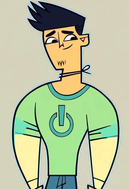 DevinTDRR, 1boy, somewhat muscular, spiky dark blue hair, black stubble, choker necklace, light green shirt, cream colored sleeves, blue baggy jeans, black and white sneakers, black eyes,