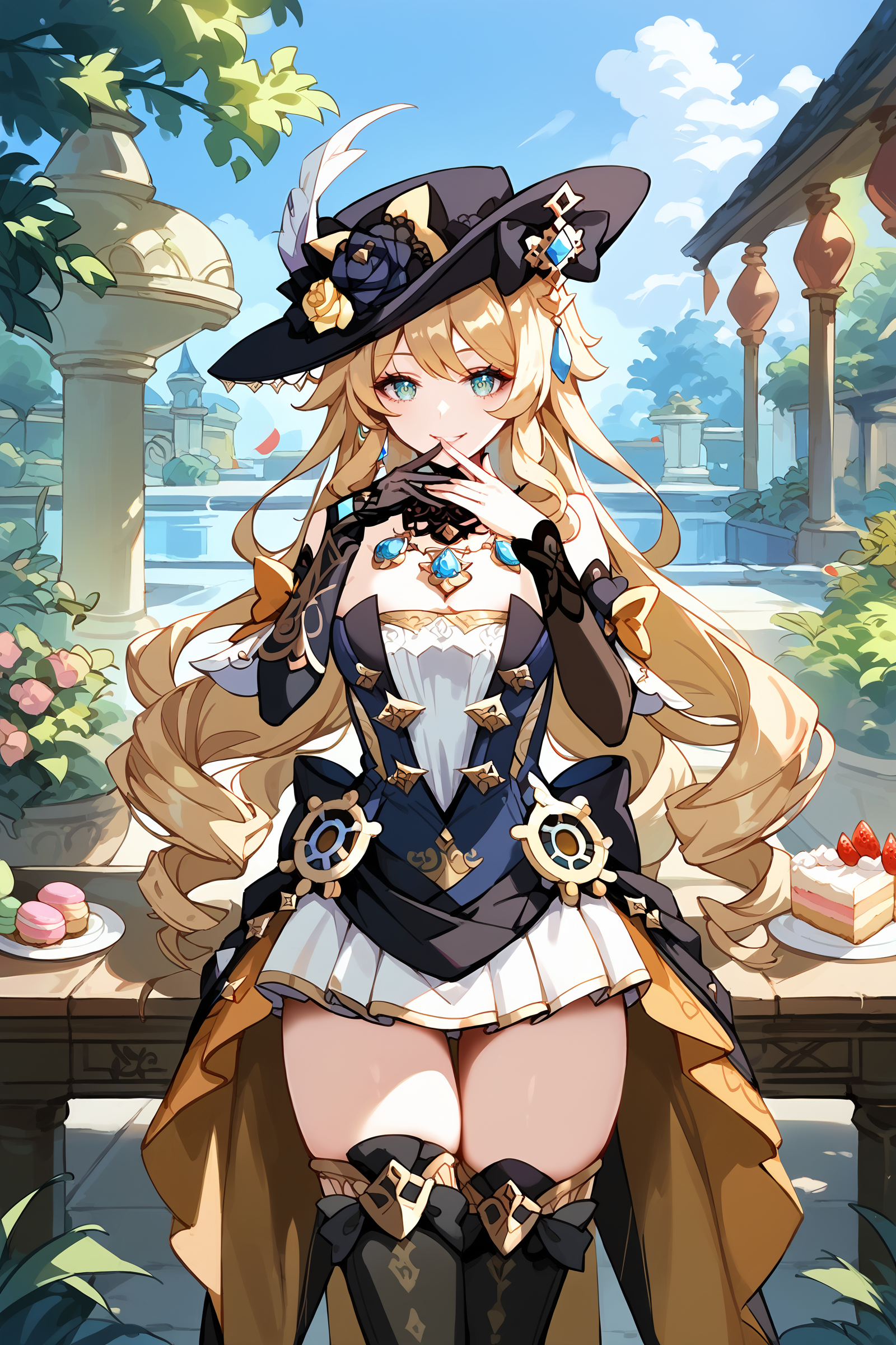 기본 의상용 추가 프롬프트(Ver.1): 모자, 허벅지 부츠, 분리형 소매, 한 손장갑, 스트랩리스 드레스, 분리형 칼라, 허리 망토, 목걸이, 보석