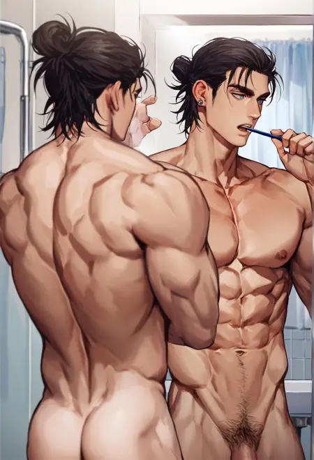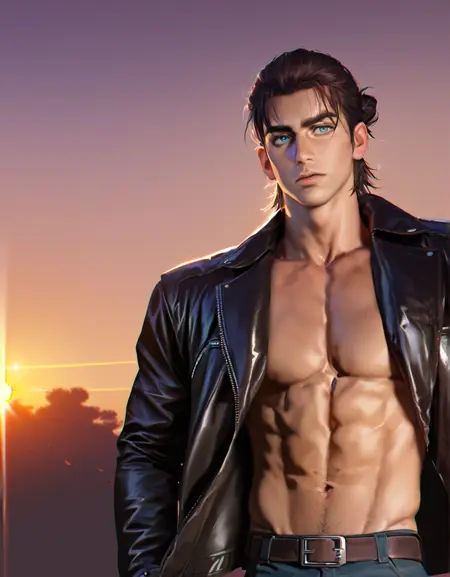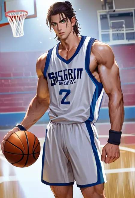 I suggest to use in the prompt: "green eyes, muscular, man bun" to give more depth to the character.