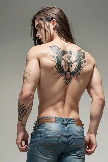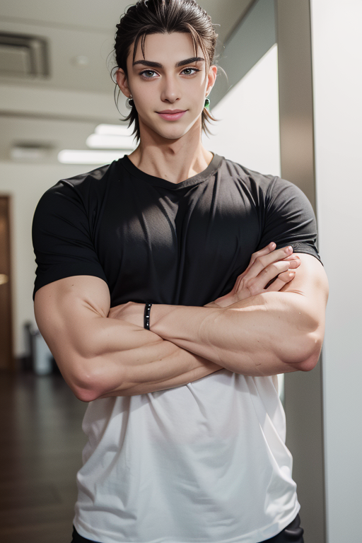 建议在提示词中使用:“绿色眼睛、肌肉发达、男士发髻”,以增强角色的深度。