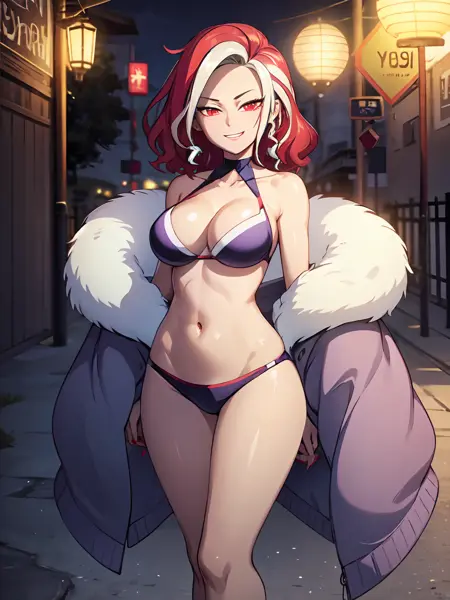 提示词: 宽袖,连裤袜,服装镂空,项圈,外套,多色头发,白发,红眼,红发,双色头发,乳房,乳沟,毛皮镶边,微笑,条纹发,红指甲,大乳房,连衣裙