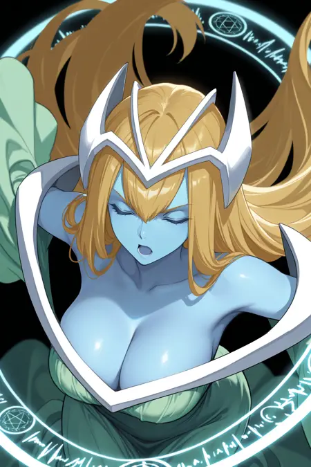 Trigger word is "melfYGO" and "blue skin, blonde hair, very long hair, closed eyes" is required.