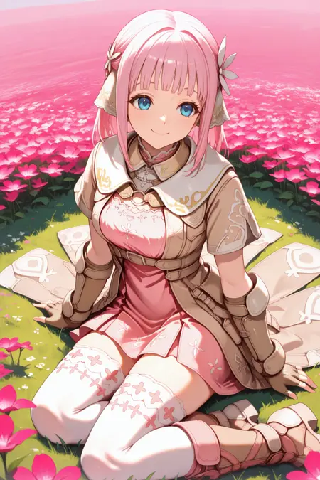 若要呈现她典型的造型,请添加 "发饰、棕色外套、短袖、粉裙、短裙、护臂、无指手套、棕色手套、白色过膝袜、靴子"。