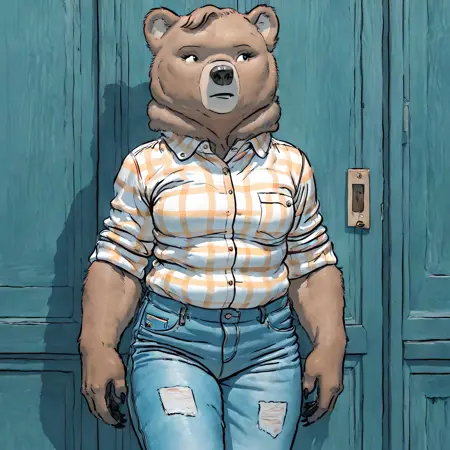 プロンプト: (水彩スタイル), (2Dカートゥーン), samstrong, 女性, アンスロ, 太め, 茶色い毛, ブラックベア, ファーフェマール, 黒い目, ポロシャツ, ジーンズ, 青いズボン