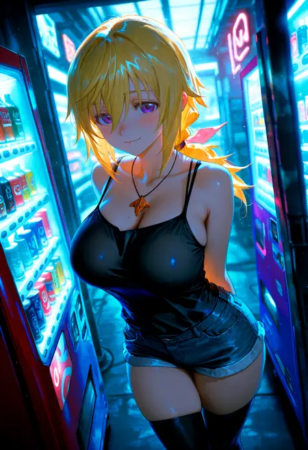 캐미솔, 데님 반바지, 허벅지까지 긴 양말, 젯타이 리ょう이키,