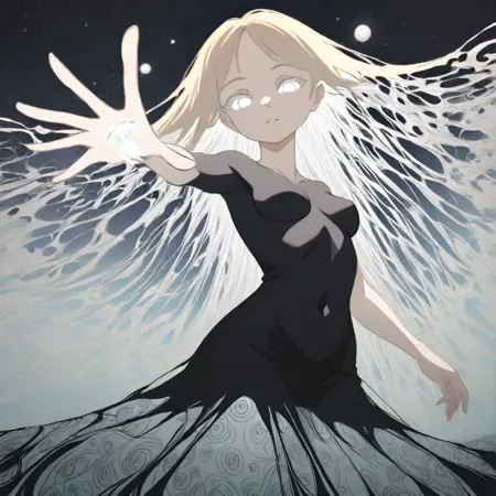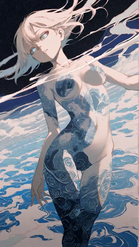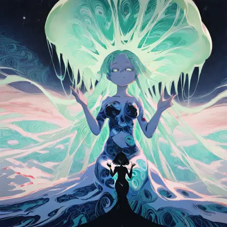 (サイケデリックアートスタイル)で描かれた、驚異的に詳細なイラスト。インクのしみが(繊細に描かれた、シュルレアリスム的な風景)を生み出し、それが(繊細で、ロルシャッハを連想させる人物)と溶け合う。この人物は、夢と想像の本質を体現している。周囲の雰囲気は、(神秘的な光)によってやわらかく照らされ、被写体とその周囲の環境に(やわらかな影)を落とし、作品に(異次元的な質感)を与える。人物のポーズは(誘惑的で挑発的)であり、日常の向こうに存在する夢とシュルレアリスムの世界の力と美しさを象徴している。