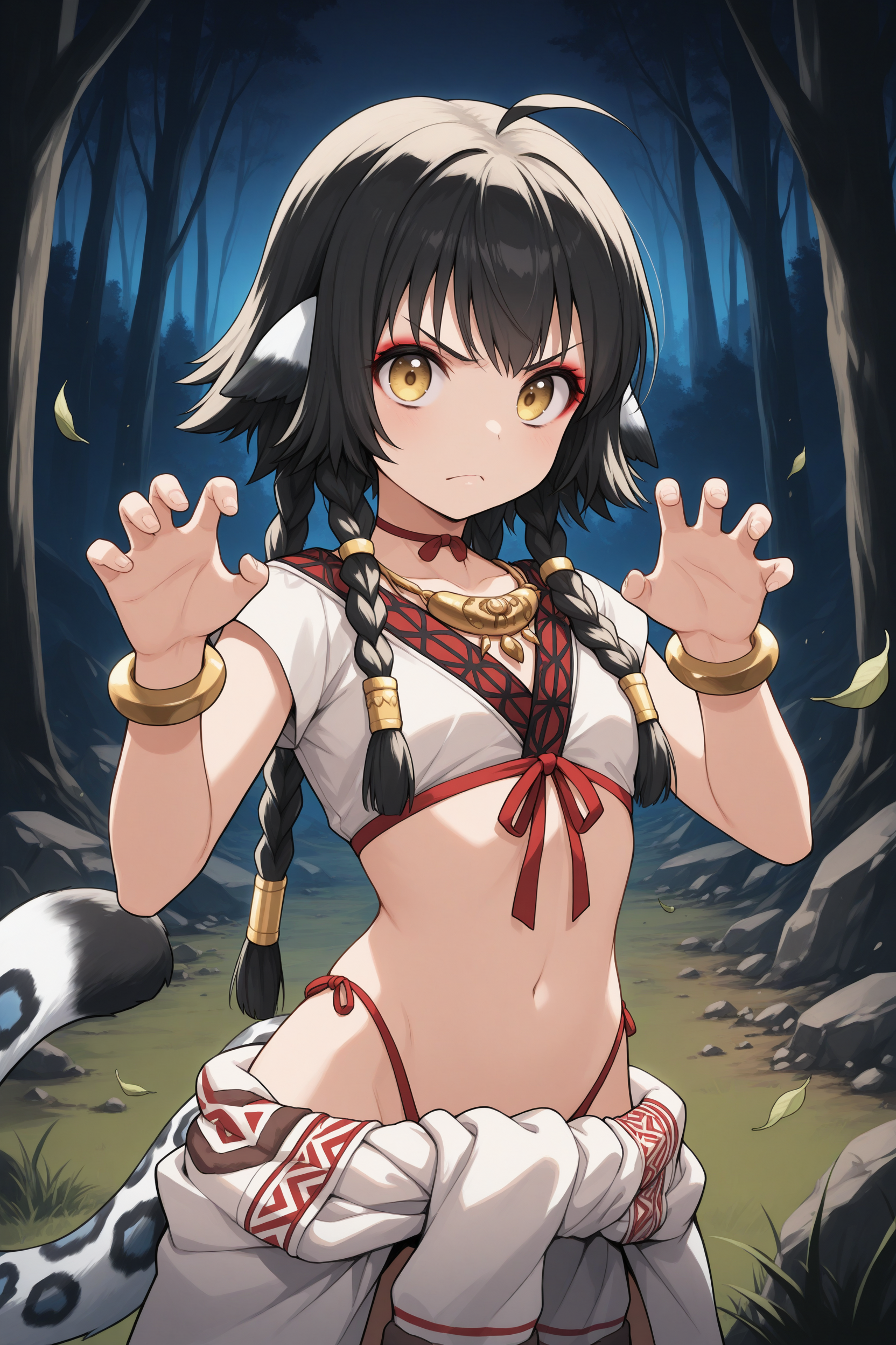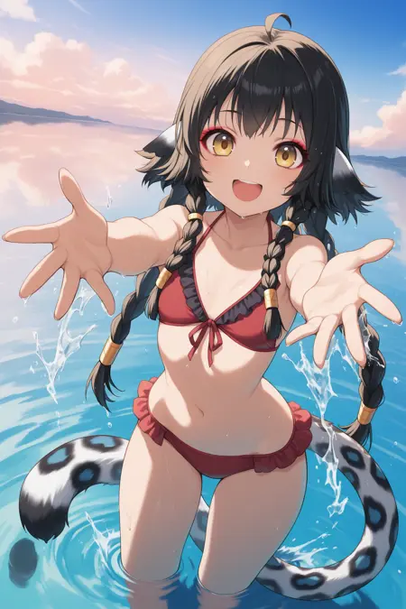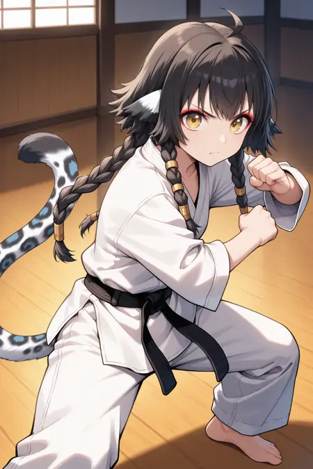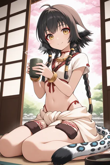 - 黑发,发管,辫子,呆毛,黄眼睛,豹尾