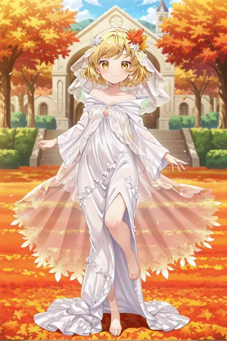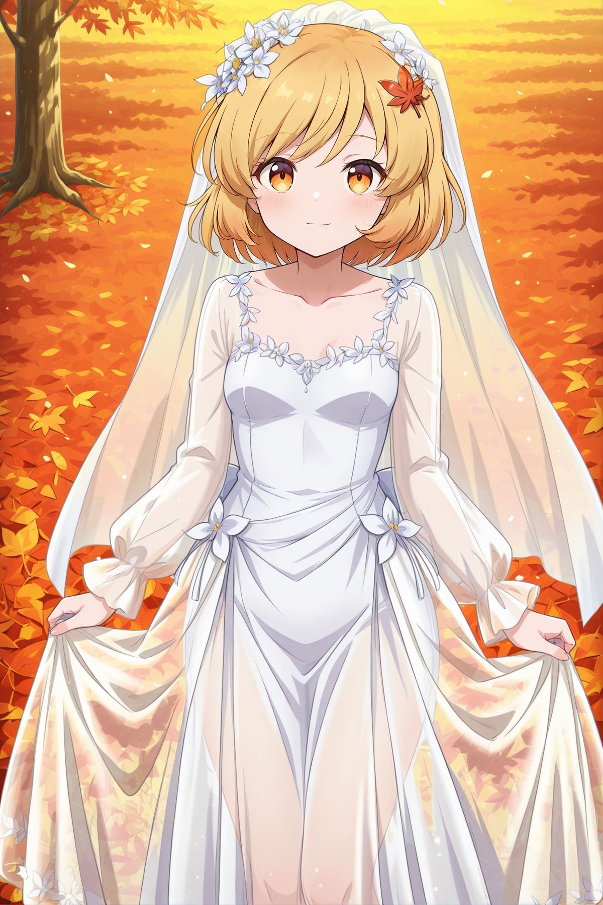 aki shizuha, 1girl, solo, yellow eyes, blonde hair, short hair, small breasts, aki shizuha \(platinum-white fall\), collarbone, bridal veil, hair flower, hair ornament, white veil, wedding dress, see-through clothes, long sleeves,