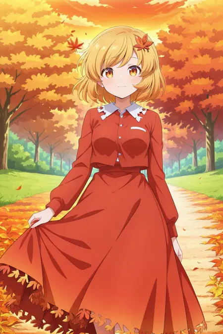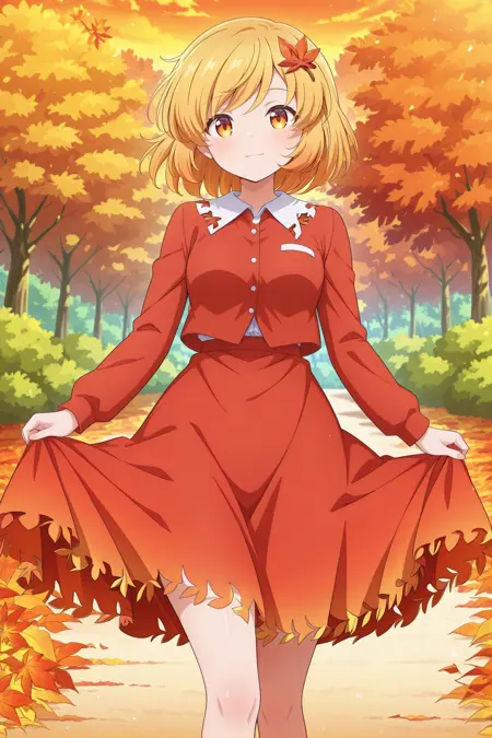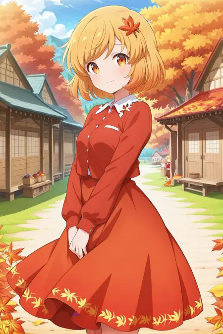 aki shizuha, 1girl, solo, yellow eyes, blonde hair, short hair, small breasts,