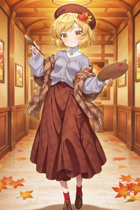 aki shizuha, 1girl, solo, yellow eyes, blonde hair, short hair, small breasts, aki shizuha \(melancholy autumn-leaf artist in winter\), alternate costume, beret, pendant, plaid clothes, brown hat, grey vest, brown skirt, long skirt, plaid skirt, leaf hair ornament, brown scarf, scarf around arms,