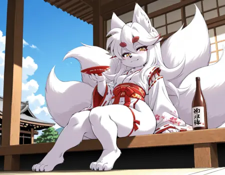 기본 프롬프트: 0t4m4, 페러리 여자, 긴 머리카락, 흰색 털, 빨간 눈썹, 노란 눈, 작은 가슴, 작고 날씬한 체형, 여러 개의 꼬리, 동물 발, 여우 발, 여우 소년, 여우 귀, 작은 체형, 짧은 몸통, 짧은 상체, 넓은 엉덩이, 짧은 다리