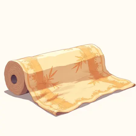 示例:zeqa avatar_/(avatar/), White background, In-game Item, still life, Anime style, A roll of fabric lies flat on a white background. The fabric is gold with a gold bamboo leaf pattern and the roll is slightly wrinkled