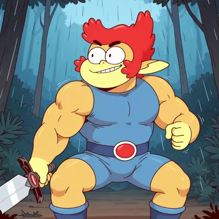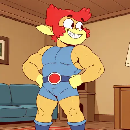 male, furry male, humanoid, solo, yellow skin, two-tone skin, red hair, short hair, black eyes, pointed ears, sharp teeth, muscular