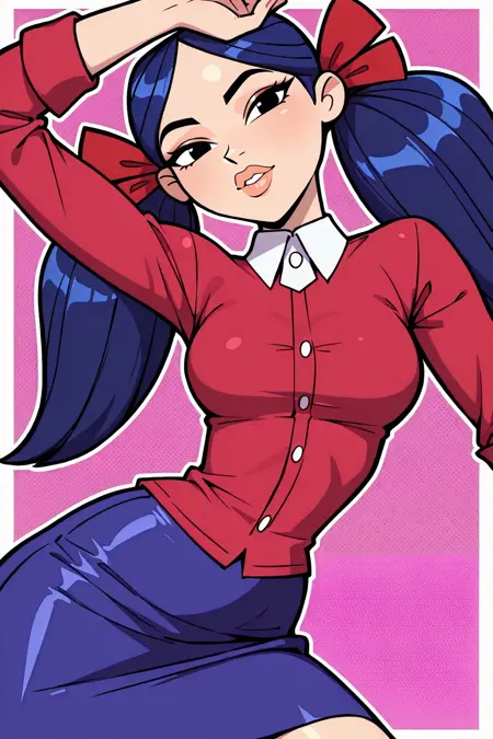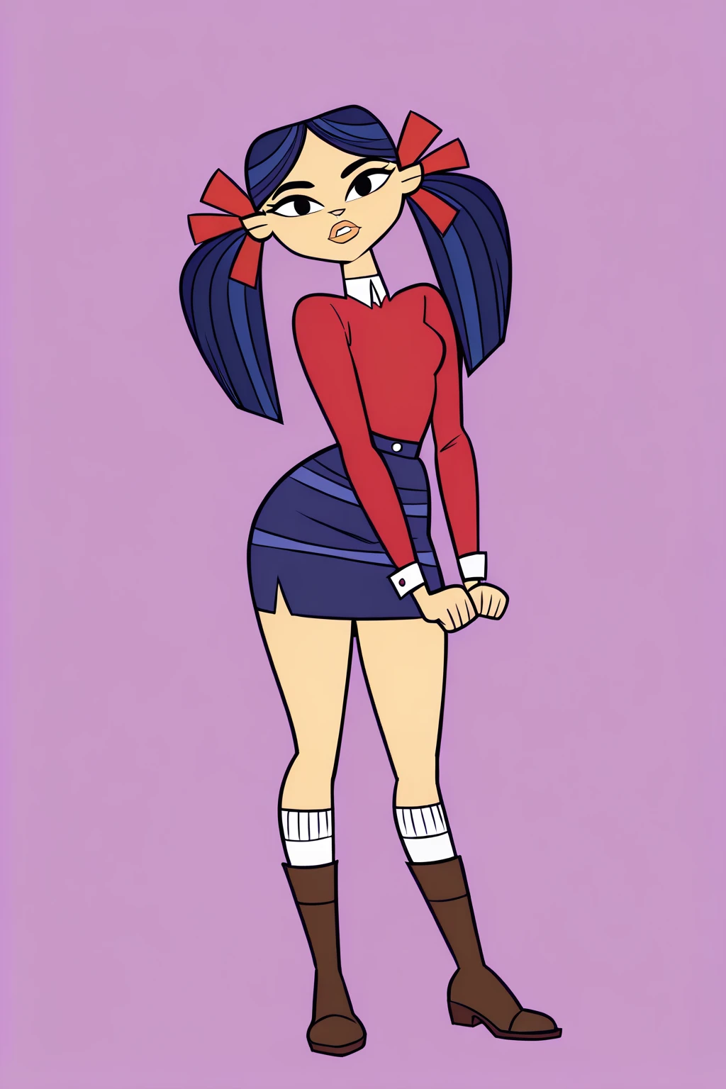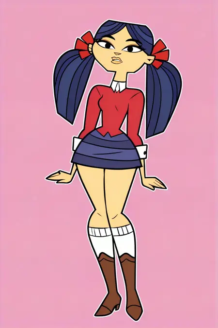 KittyTDRR, 1girl, dark blue hair, ponytails, red head bows, red shirt with half-long sleeves, white collar, blue skirt, cream colored white socks, dark brown boots, black eyes, lips, big lips, kitty (tdi),