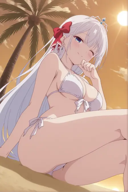 基本:rise-ray、1girl、青い目、長い髪、銀髪、赤い髪リボン