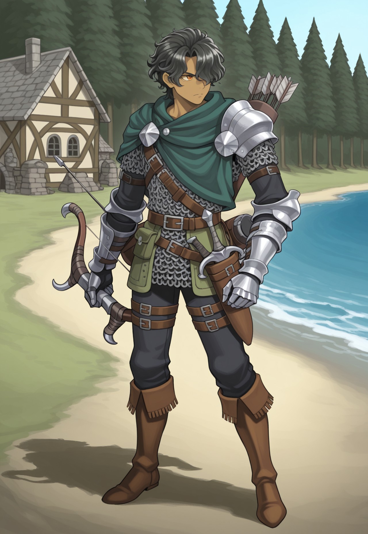 弓箭手服装,肩甲,胸带,护手,棕色靴子,