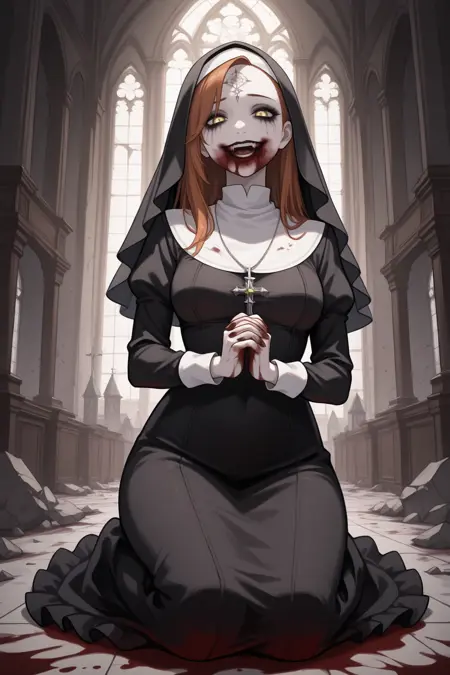 Appearance : d4ni3la, pale skin, medium breasts, yellow eyes, orange hair, long hair, forehead mark, black lips, runny makeup, blood from mouth
