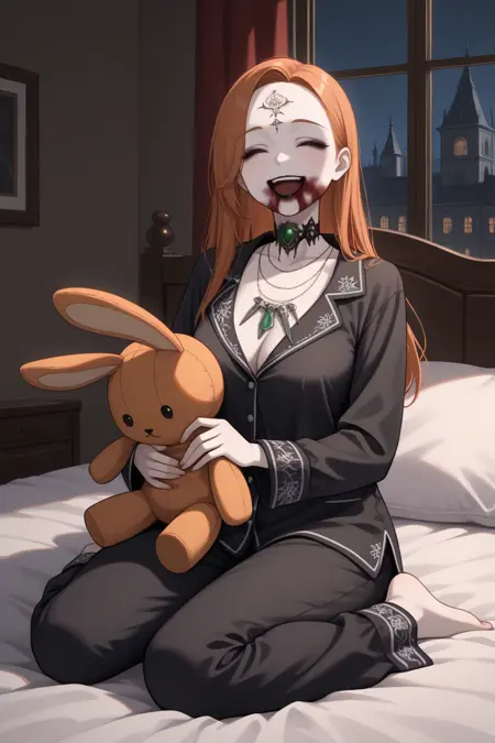 외모: d4ni3la, 창백한 피부, 중간 크기의 가슴, 노란 눈, 주황색 머리카락, 긴 머리, 이마의 문양, 검은 입술, 번진 메이크업, 입에서 흘러나오는 피