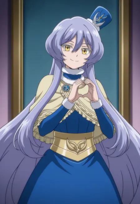 Trigger = zzteltinazz, Tags = long hair, yellow eyes, 1girl, hat, fur trim, very long hair, capelet, blue hair, hair between eyes, solo, dress, smile, mini hat, bangs, blue headwear, purple hair, blue dress,