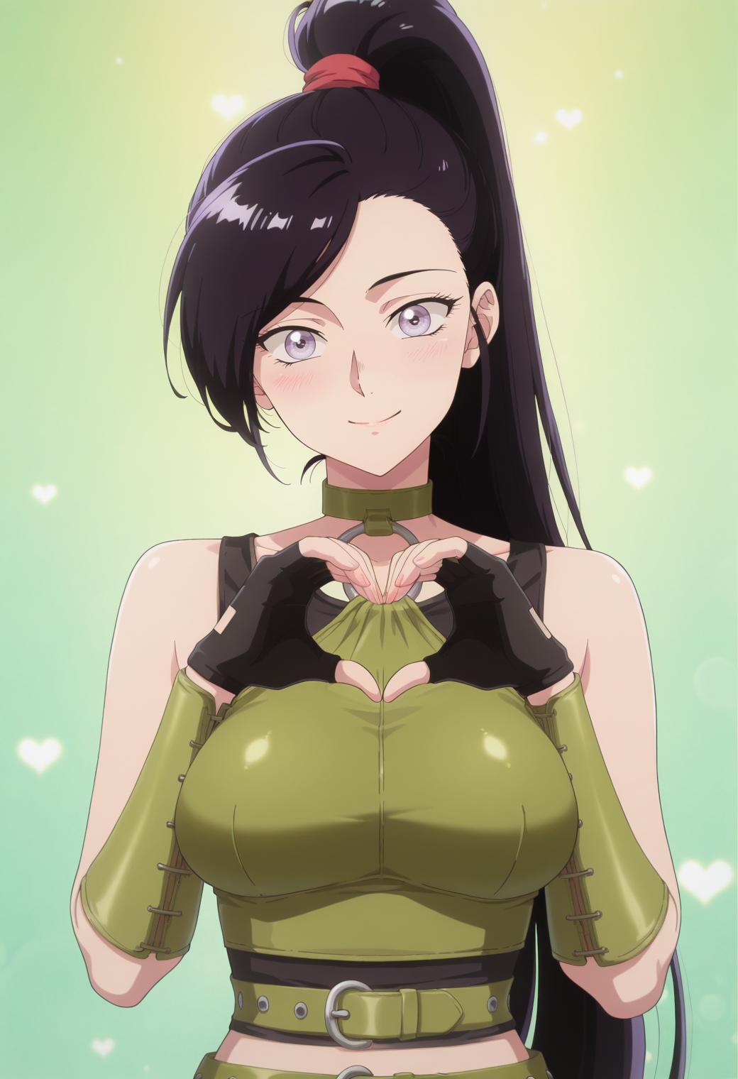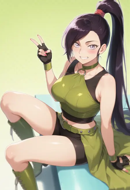 jade, purple eyes, black hair, very long hair, hair scrunchie, high ponytail, swept bangs,