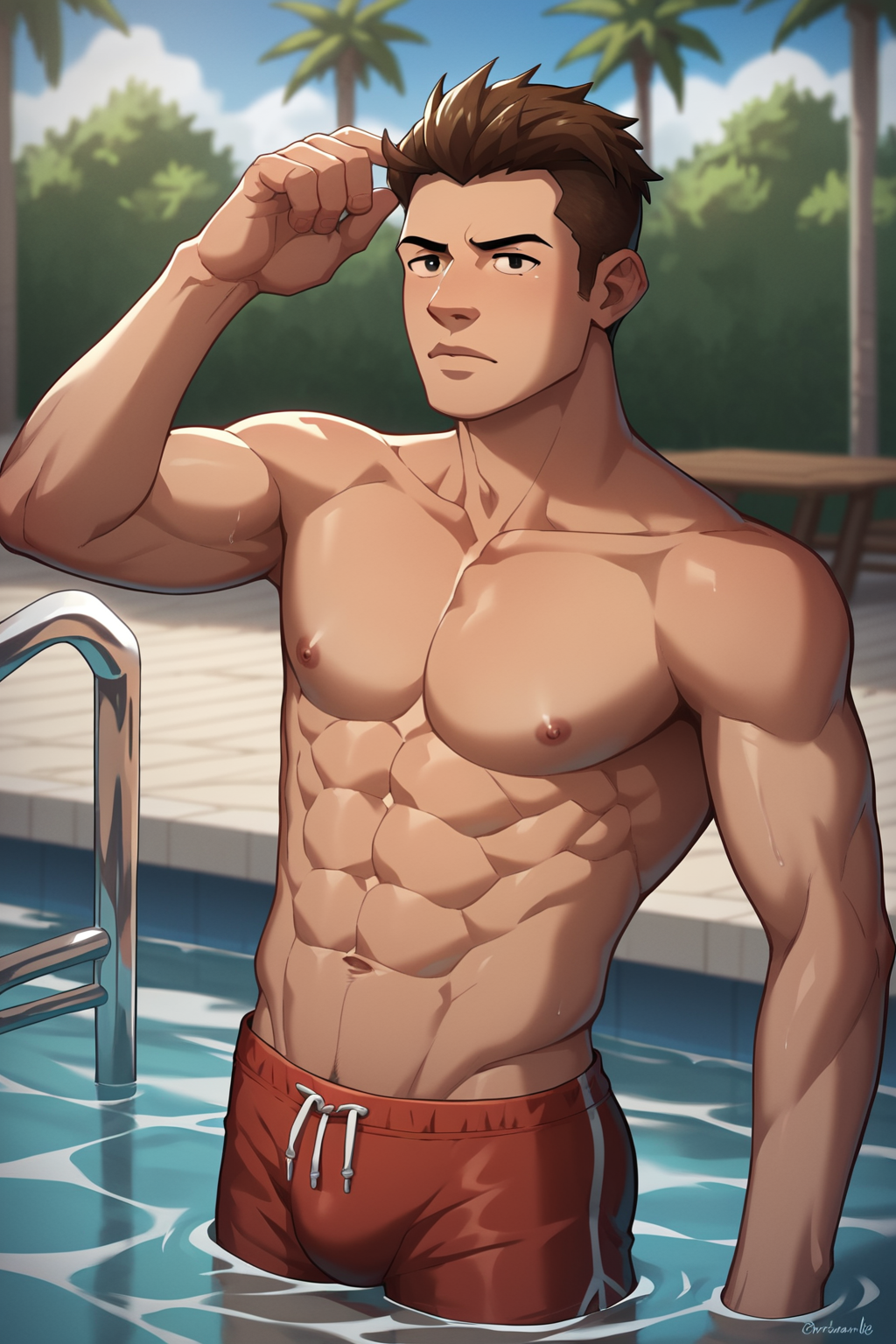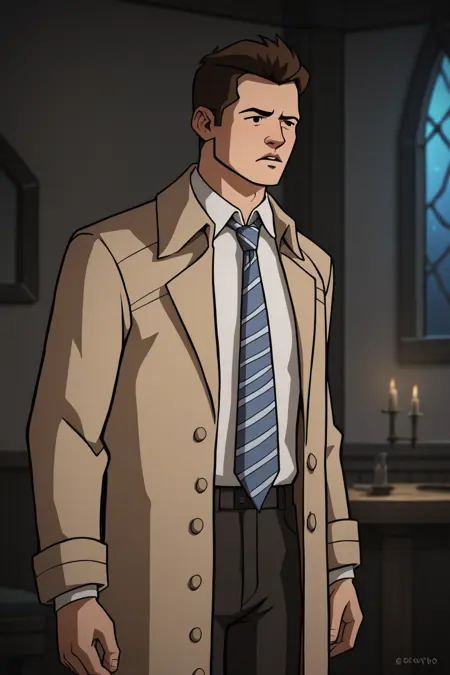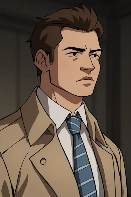 brown hair, short hair, trench coat, white shirt, blue necktie, striped necktie, dark pants,
