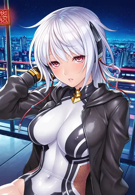 Tags: amamiya shisui, short hair, white hair, red eyes, lips, medium breasts, shiny skin, shiny clothes