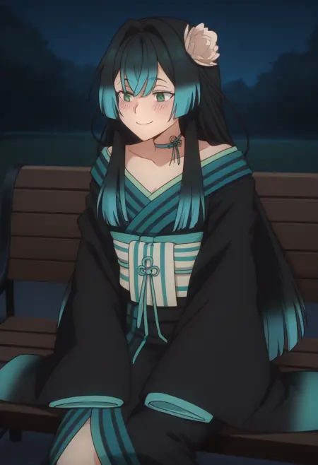 트리거 = zzcarmillazz, 태그 = 긴 머리, 단독, 다색 머리, 검은 머리, 꽃, 머리 장식, 머리에 핀 꽃, 앞머리, 1소녀, 일본 복장, 녹색 눈, 기모노, 목걸이, 미소, 파란 머리, 소매가 손가락을 넘음, 띠,