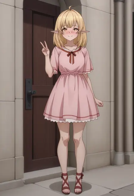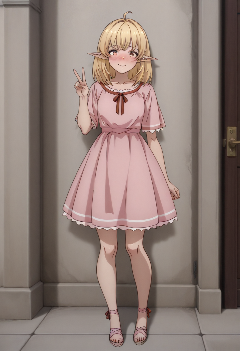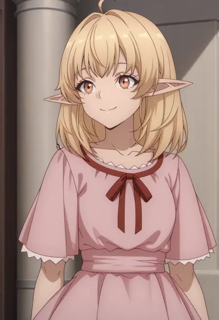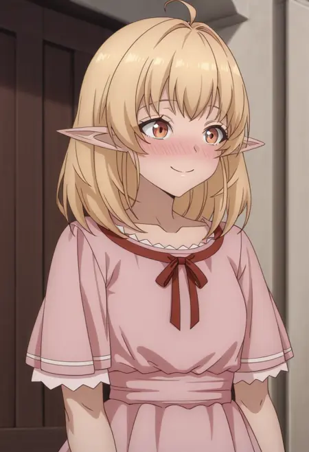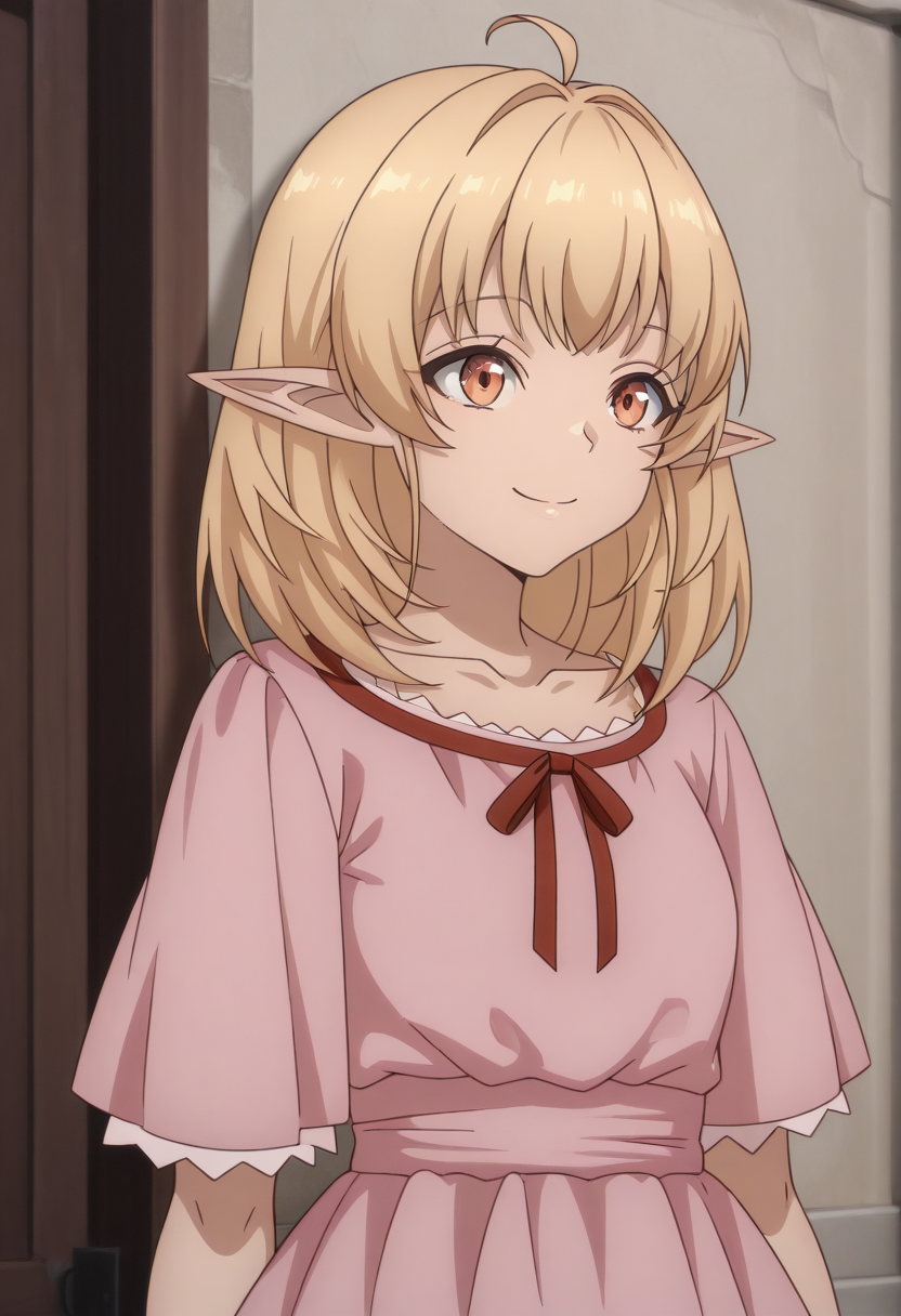 トリガー = zzlilyzz、タグ = 1girl、尖った耳、シングル、金色の髪、リボン、笑顔、赤いリボン、前髪、エルフ、ahoge、短い袖、ピンクのシャツ、中くらいの髪、鎖骨、ドレス、ピンクのドレス