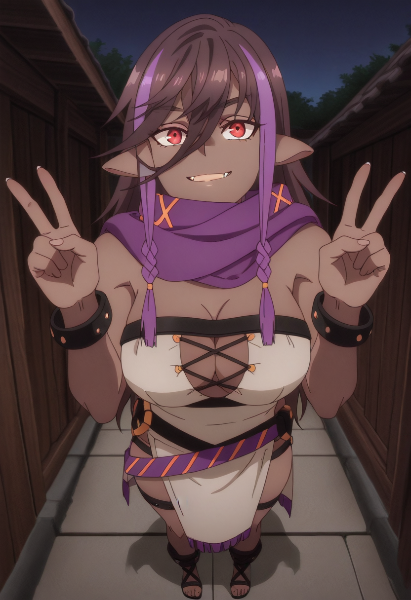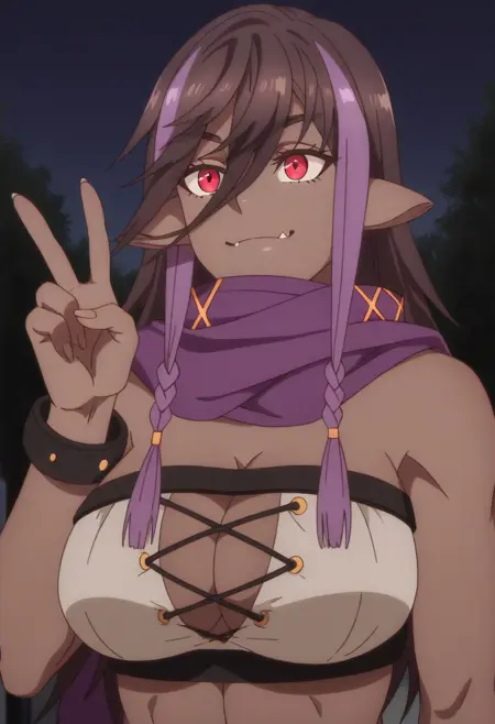 触发词 = zzloewezz,标签 = 尖耳朵、深色皮肤女性、深色皮肤、1个女孩、围巾、单人、长发、多色头发、乳房、乳沟、紫色头发、微笑、红眼睛、紫色围巾、珠宝、尖牙、棕色头发、手镯、尖牙、大乳房
