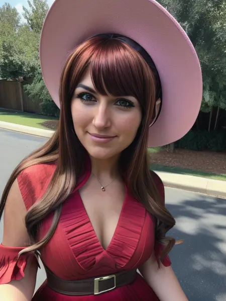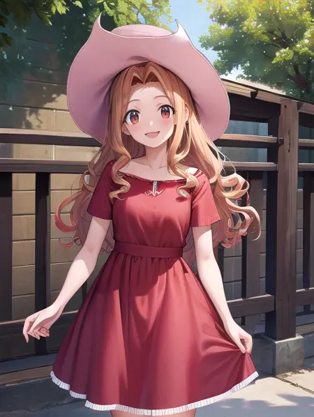 Additional words that may help: split bangs, red dress,long hair, brown hair, pink hat, curly hair, gloves