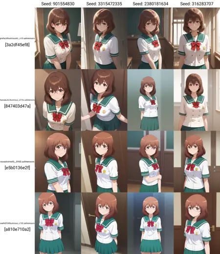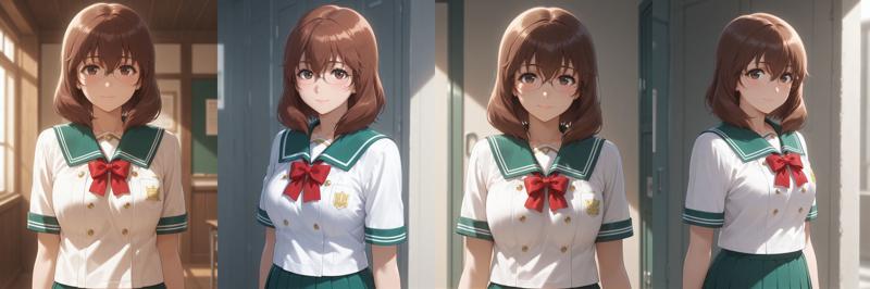 학교 교복, 녹색 치마, 짧은 소매, 주름 치마, 흰색 셔츠, 빨간 리본 넥타이, 녹색 해군풍 칼라