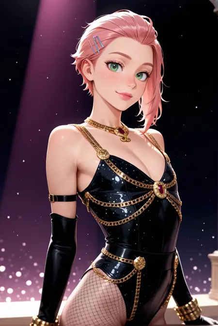 chain outfit, black Leotard, cleavage, sleeveless, golden chain, jewelry,