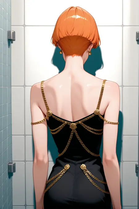 chain outfit, black dress, cleavage, sleeveless, golden chain, jewelry,