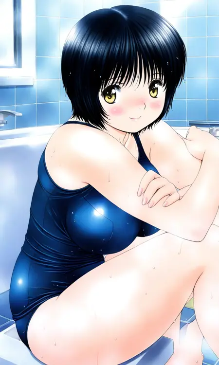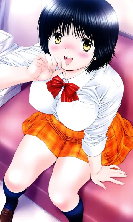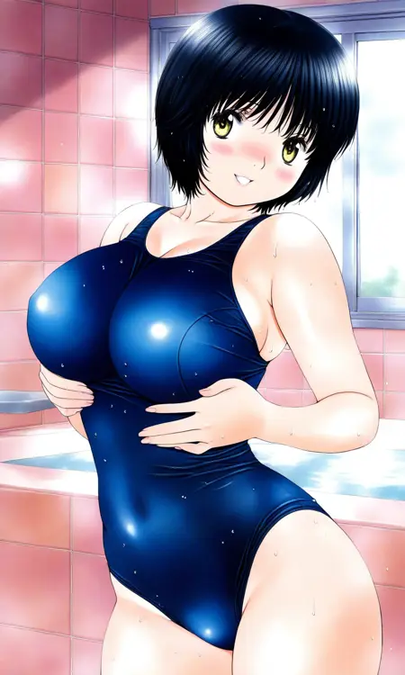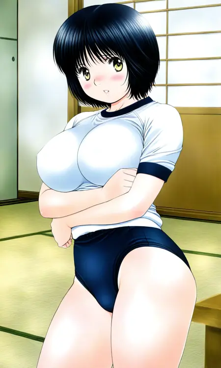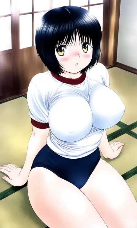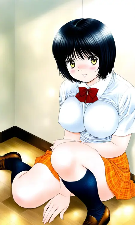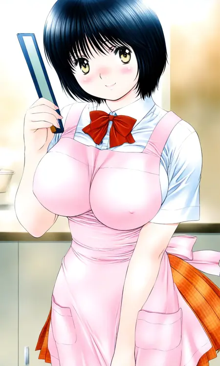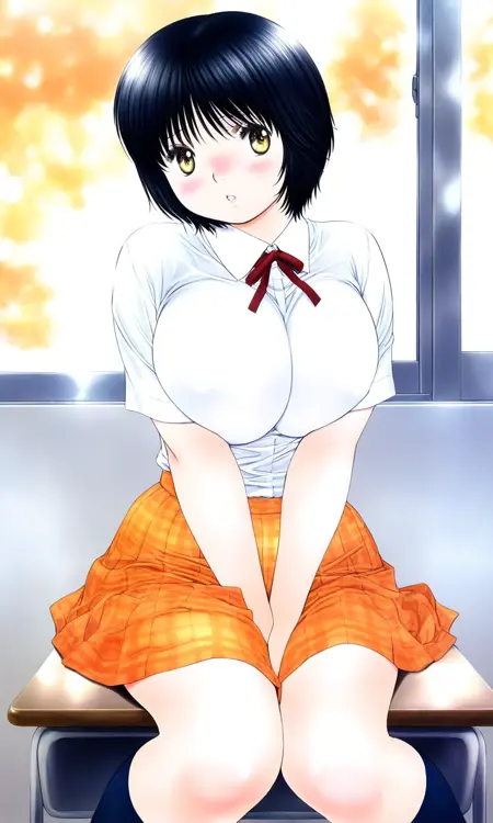 onohara_asami, 1girl, solo, black hair, short hair, large breasts, yellow eyes,