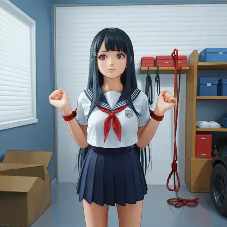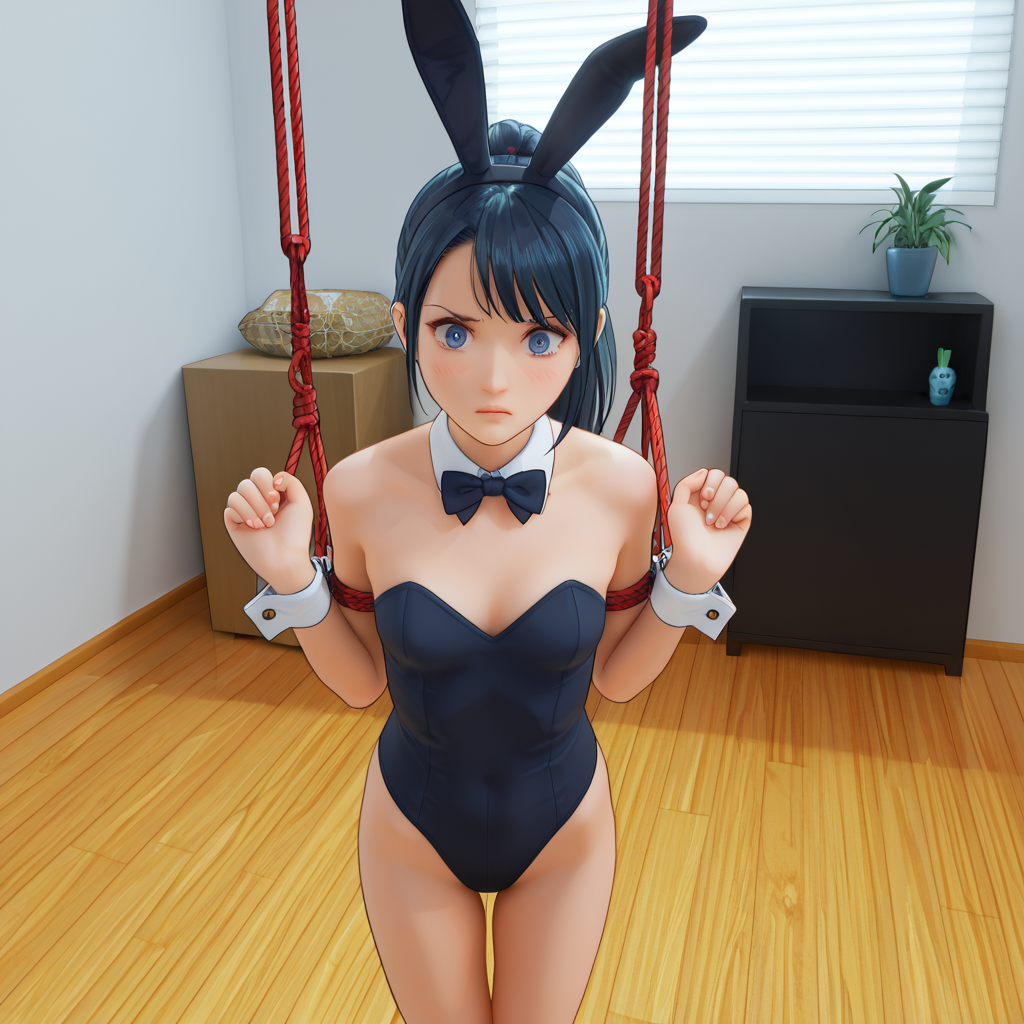 You can use these prompts to get variations: crotch rope, bound+part, double V, middle finger, fists,