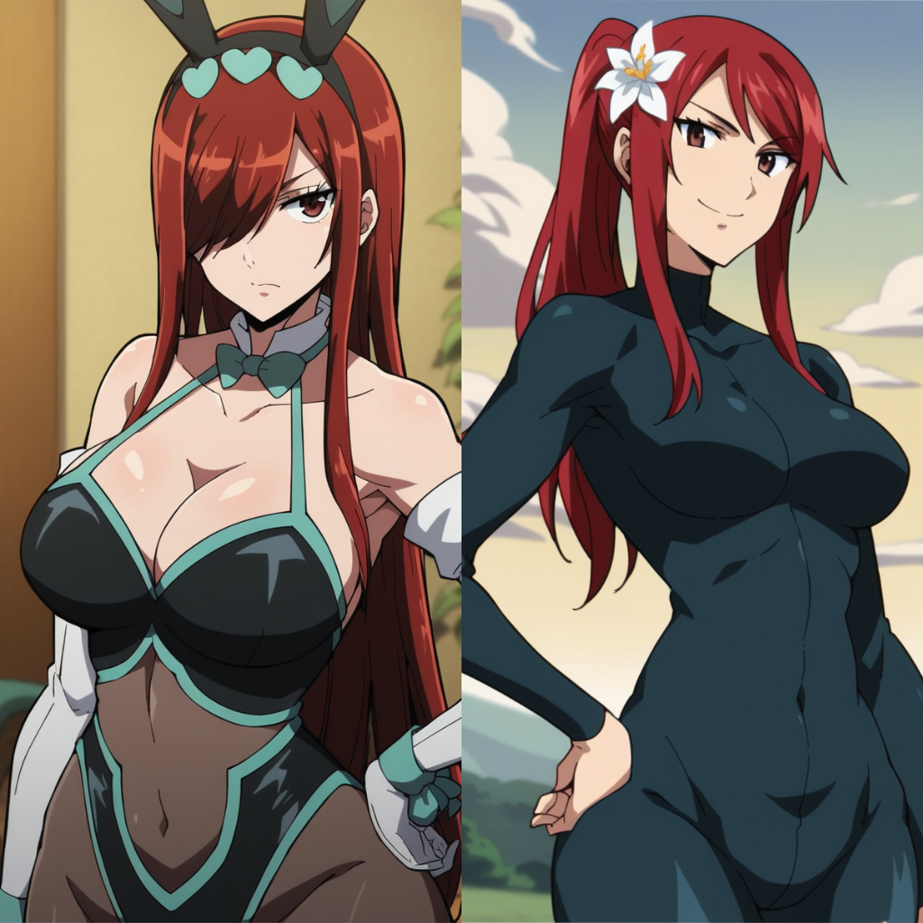 说实话,在收到这个请求之前,我一直以为她的名字拼写是 Ezra。不管怎样,她在《龙cry》中的兔女郎装绝对是我在见过的最美观的设计之一,我很高兴它引起了我的注意。由于这个模型是基于电影中的兔女郎装和较低清晰度剧集中的“Jiggle Butt Gang”紧身衣进行训练的,因此兔女郎装生成的图像保真度通常更高,所以如果你发现生成的图像质量有差异,不要感到困惑。据我个人经验,当你提示紧身衣时,可能需要比提示兔女郎装使用更高的权重,但我可能完全错了。