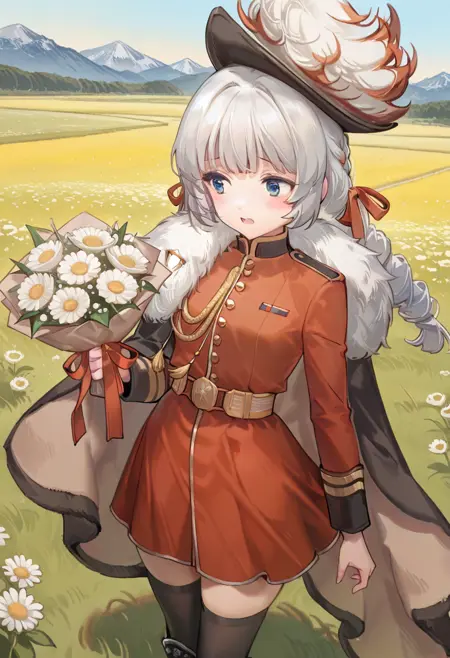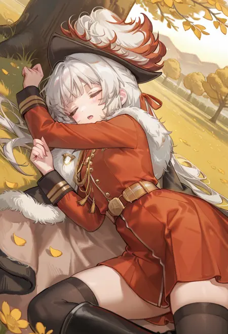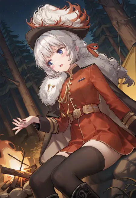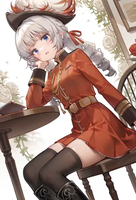 charlie(TMAC),灰发,腰带,筒状帽,红丝带,及膝靴,白色毛边,纽扣,蓝眼睛,黑色过膝袜,
