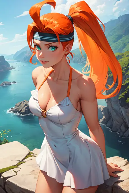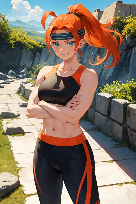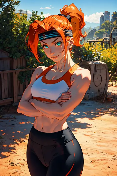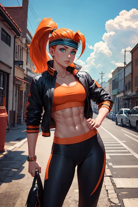 트리거: **"Ringfittrainee, orange hair, ponytail, aqua eyes"**는 항상 필요하며, 그녀의 주요 룩을 위해 "toned, fiery hair, aqua eyes"도 추가하세요.