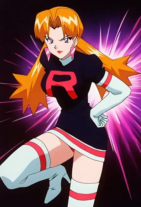 Team Rocket Uniform, black dress, white gloves, elbow gloves, zettai ryoiki, white thighhighs, high heel boots