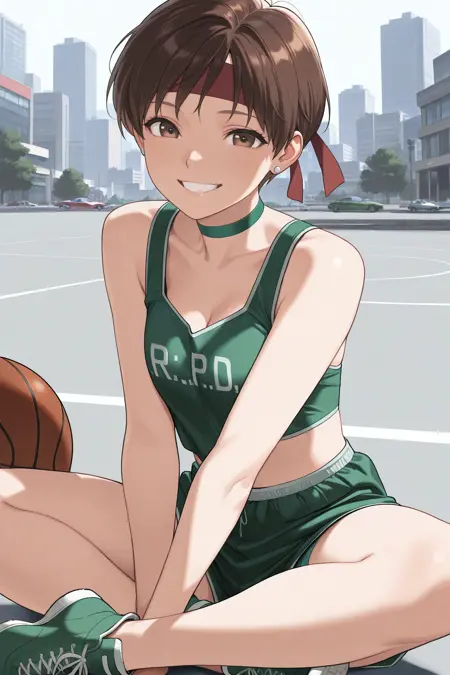 농구 유니폼은 "** 귀걸이, 빨간 헤드밴드, 녹색 목줄, 녹색 스포츠 브라, 옷에 쓰인 글자, 녹색 쇼츠, 짧은 쇼츠, 녹색 스니커즈**"를 추가하세요.
