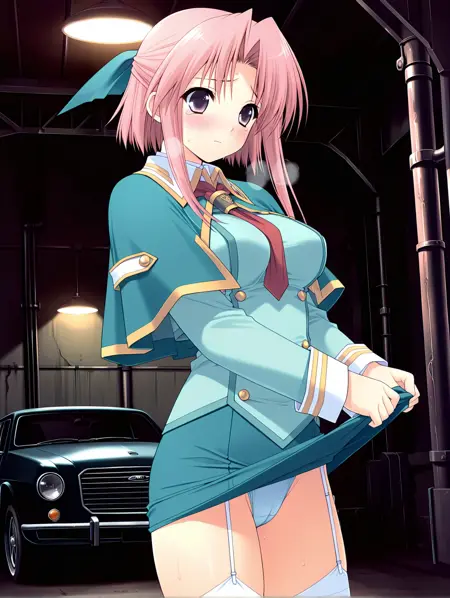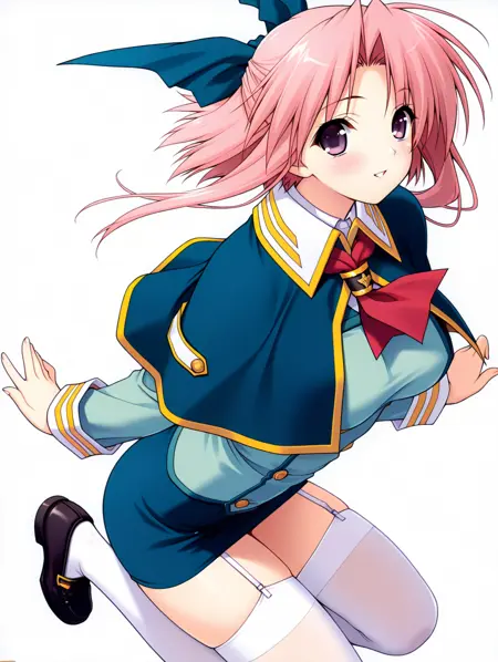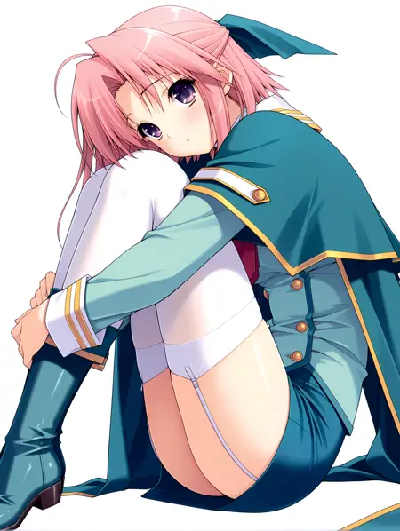 衣装ワード:nao_clothes, capelet, long sleeves, shirt, skirt, zettai ryouiki, garter straps, white thighhighs, boots